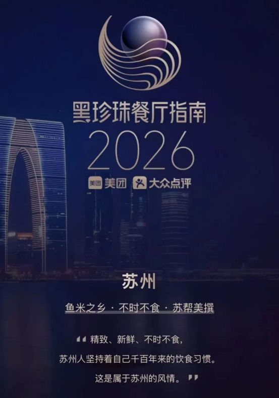 近日,2026年黑珍珠餐廳指南”正式發布。今年蘇州共有10家餐廳上榜,風光旖旎的金雞湖畔更是匯聚6家寶藏餐廳,分別是江南雅廚(李公堤店)、悅山府8號·CHAI8HOUSE(李公堤店)、蘇州洲際酒店·里瓦地中海扒房、金海華·悅食東方·CHAO27(洲際店)、蘇州柏悅酒店·西洲軒、蘇州凱悅酒店·華池88中餐廳。