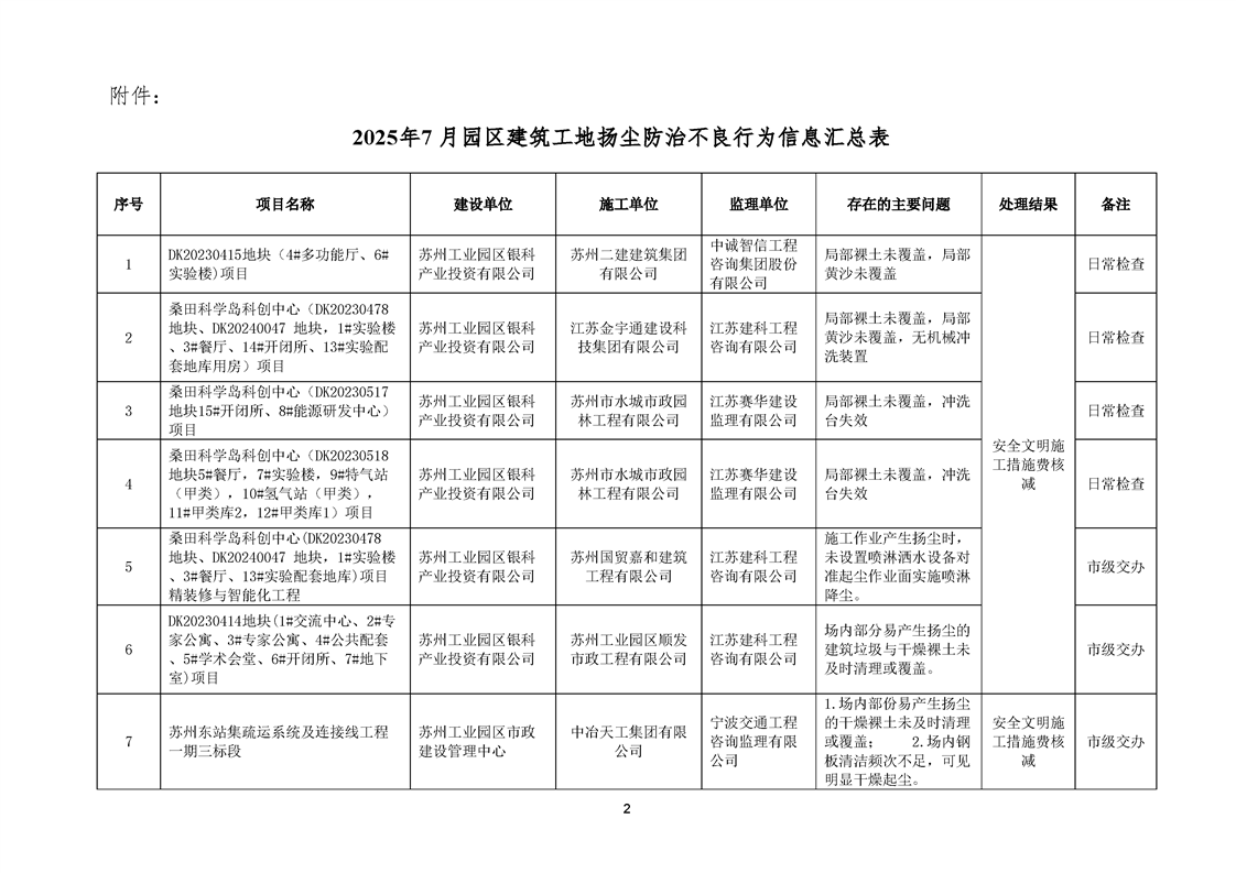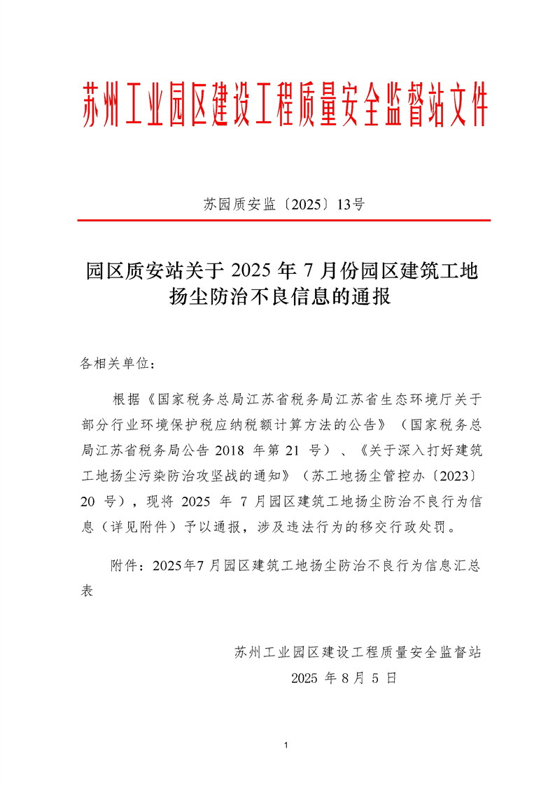園區質安站關于2025年7月份園區建筑工地揚塵防治不良信息的通報