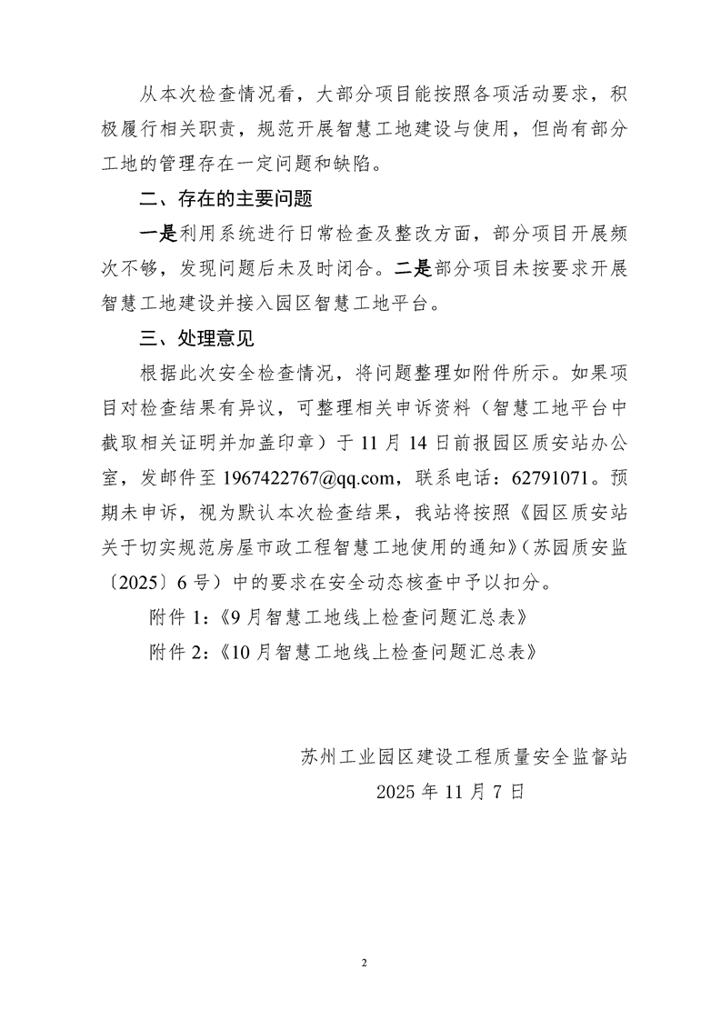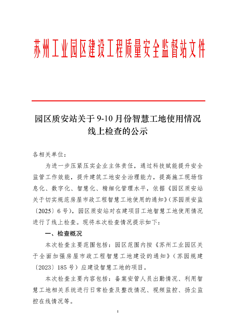 園區質安站關于9-10月份智慧工地使用情況線上檢查的公示