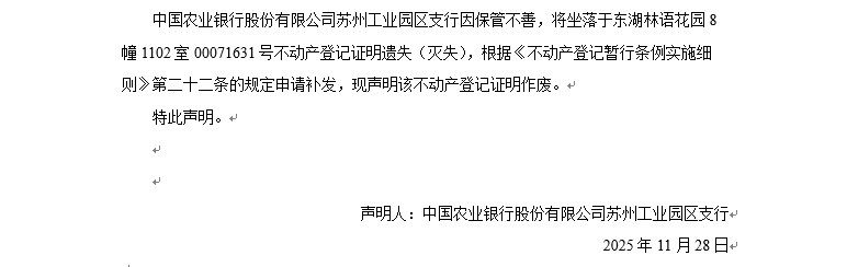 關(guān)于東湖林語花園8幢1102室00071631號(hào)不動(dòng)產(chǎn)登記證明遺失聲明