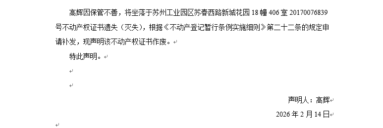 關于蘇州工業園區蘇春西路新城花園18幢406室20170076839號不動產權證書遺失聲明