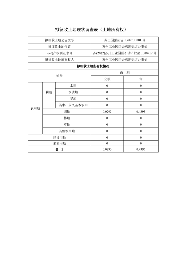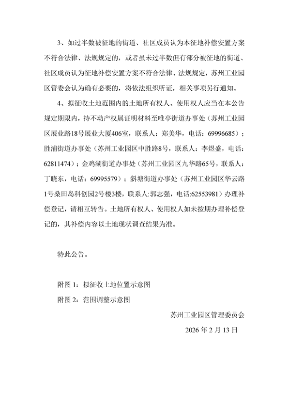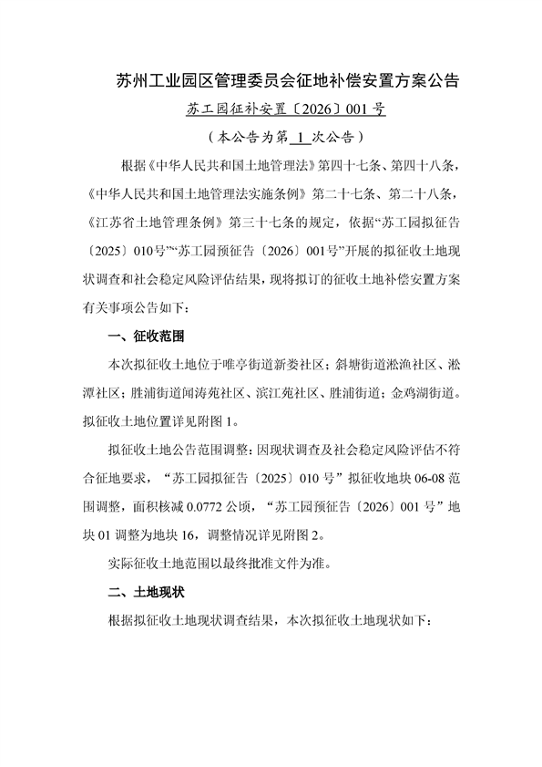 蘇州工業(yè)園區(qū)管理委員會(huì)征地補(bǔ)償安置方案公告(蘇工園征補(bǔ)安置〔2026〕001號)