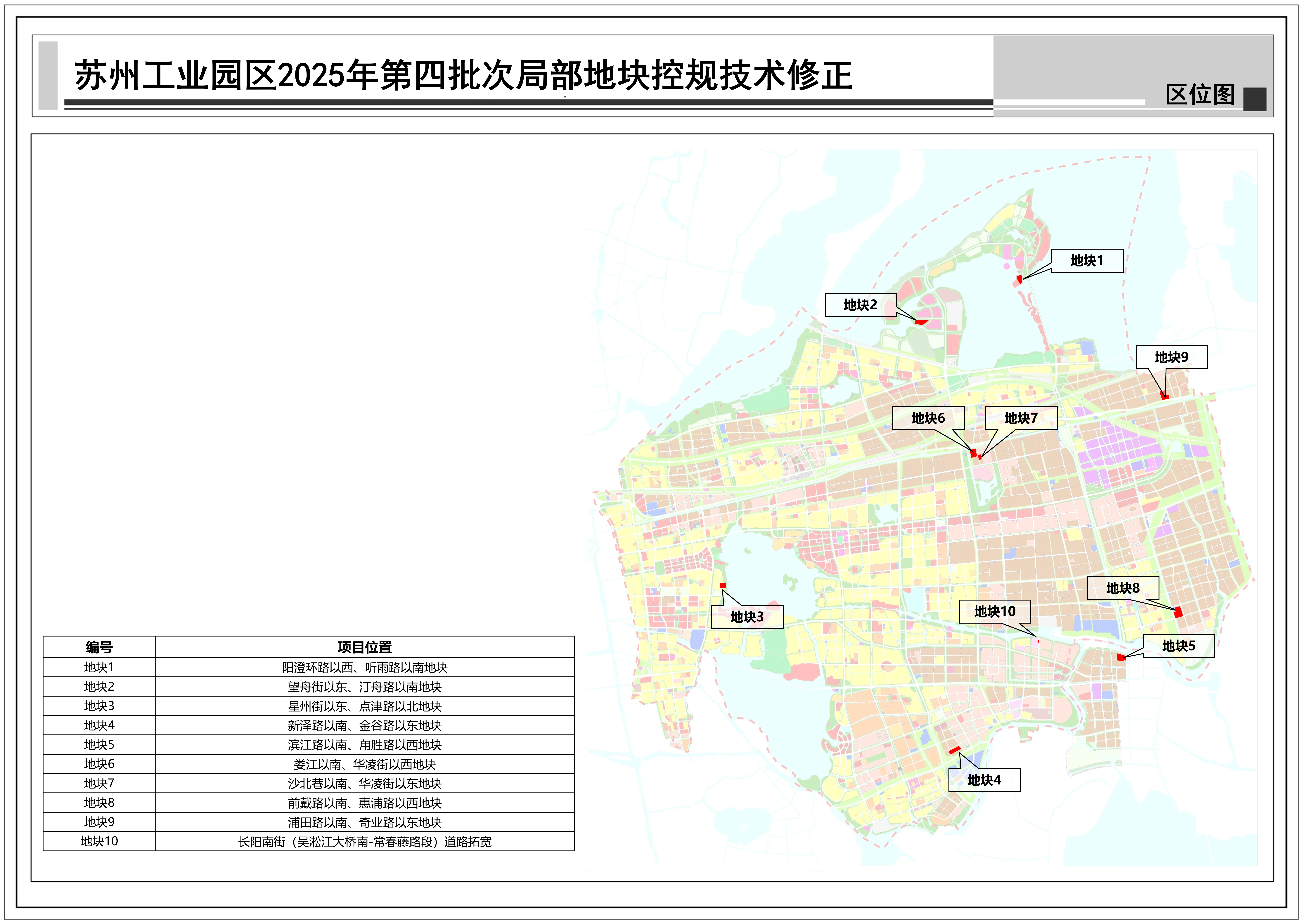 蘇州工業園區2025年第四批次局部地塊控規技術修正:共包括10個地塊,總用地面積約0.39平方公里,詳見附圖區位圖。