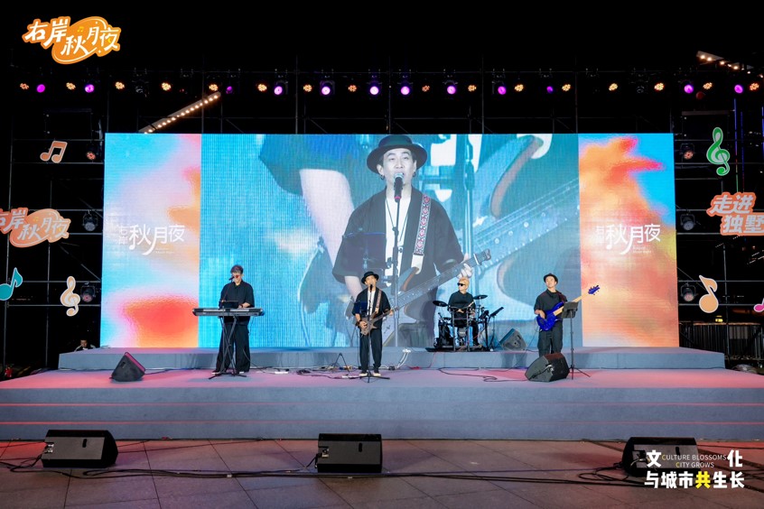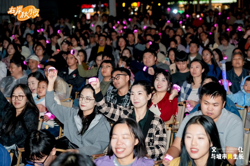 當(dāng)晚的“右岸秋月夜”歌單,滿是秋的詩意與青春的朝氣,裹挾著蓬勃熱意感染全場。粵語經(jīng)典《紅日》一響,瞬間點燃現(xiàn)場熱情;《戀愛ing》《小情歌》等曲目則以青澀旋律喚起共鳴。流行樂隊、實力唱將、素人歌手輪番登場,帶著對音樂的熱愛為演出注入鮮活能量。一首首經(jīng)典曲目引發(fā)觀眾頻頻揮手合唱,手中的手環(huán)燈光閃爍交織,宛如一片璀璨星海,將獨墅湖的秋夜點綴得格外浪漫。