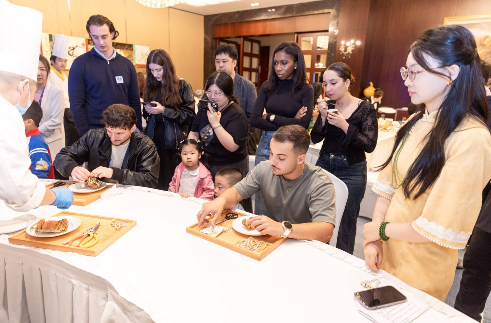 在品嘗美味的同時,豐富多彩的文化互動體驗也吸引著眾多參與者。蘇式綠豆糕制作區(qū)里,在大廚的悉心指導(dǎo)下,不少外國朋友親手制作出精致的江南點心;陽澄湖大閘蟹標(biāo)準(zhǔn)拆解演示,則讓食客們領(lǐng)略到江南飲食文化的深厚底蘊(yùn)。“筷子挑戰(zhàn)賽”和“盲品食物猜猜猜”等互動游戲不僅拉近了彼此的距離,也讓中外文化交流更加輕松愉悅,現(xiàn)場不時傳來陣陣笑聲。