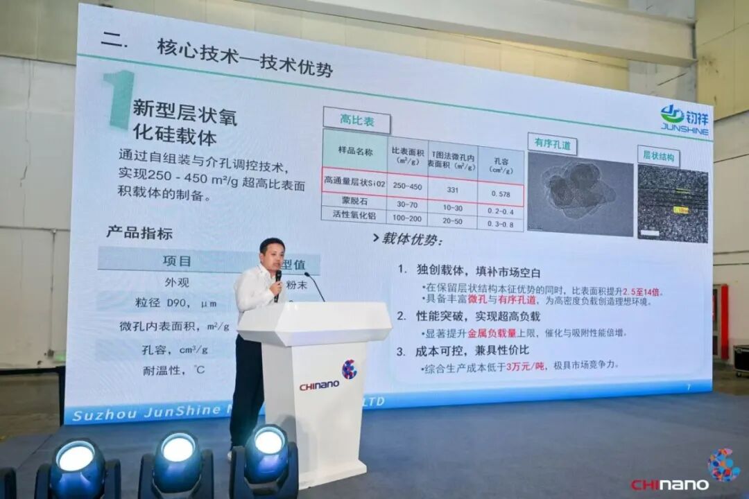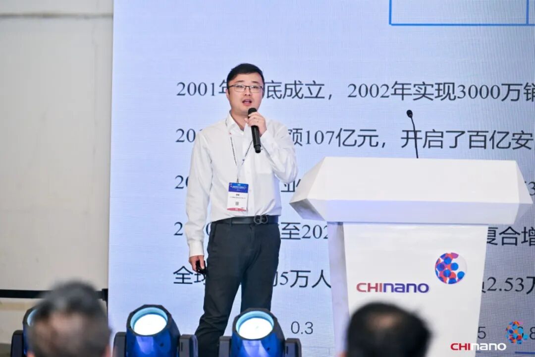蘇州鈞祥新材料有限公司技術(shù)總監(jiān)徐黎明,帶來了主題《高通量負(fù)載的層狀氧化硅納米材料》的分享。他介紹道:其公司研發(fā)的高通量負(fù)載層狀氧化硅納米材料,突破了傳統(tǒng)金屬納米粒子負(fù)載技術(shù)瓶頸,具備超高比表面積和有序孔道結(jié)構(gòu),實現(xiàn)了金屬納米顆粒的高負(fù)載與均勻分散,有效解決了高溫?zé)Y(jié)與團聚等行業(yè)痛點。該材料在無機抗菌、高效催化、電磁屏蔽、鋰電隔膜等領(lǐng)域展現(xiàn)出廣泛應(yīng)用潛力,已通過多家單位試用并實現(xiàn)銷售,具有成本低、性能優(yōu)、可定制等優(yōu)勢,為推動納米材料產(chǎn)業(yè)化發(fā)展提供了關(guān)鍵支撐。