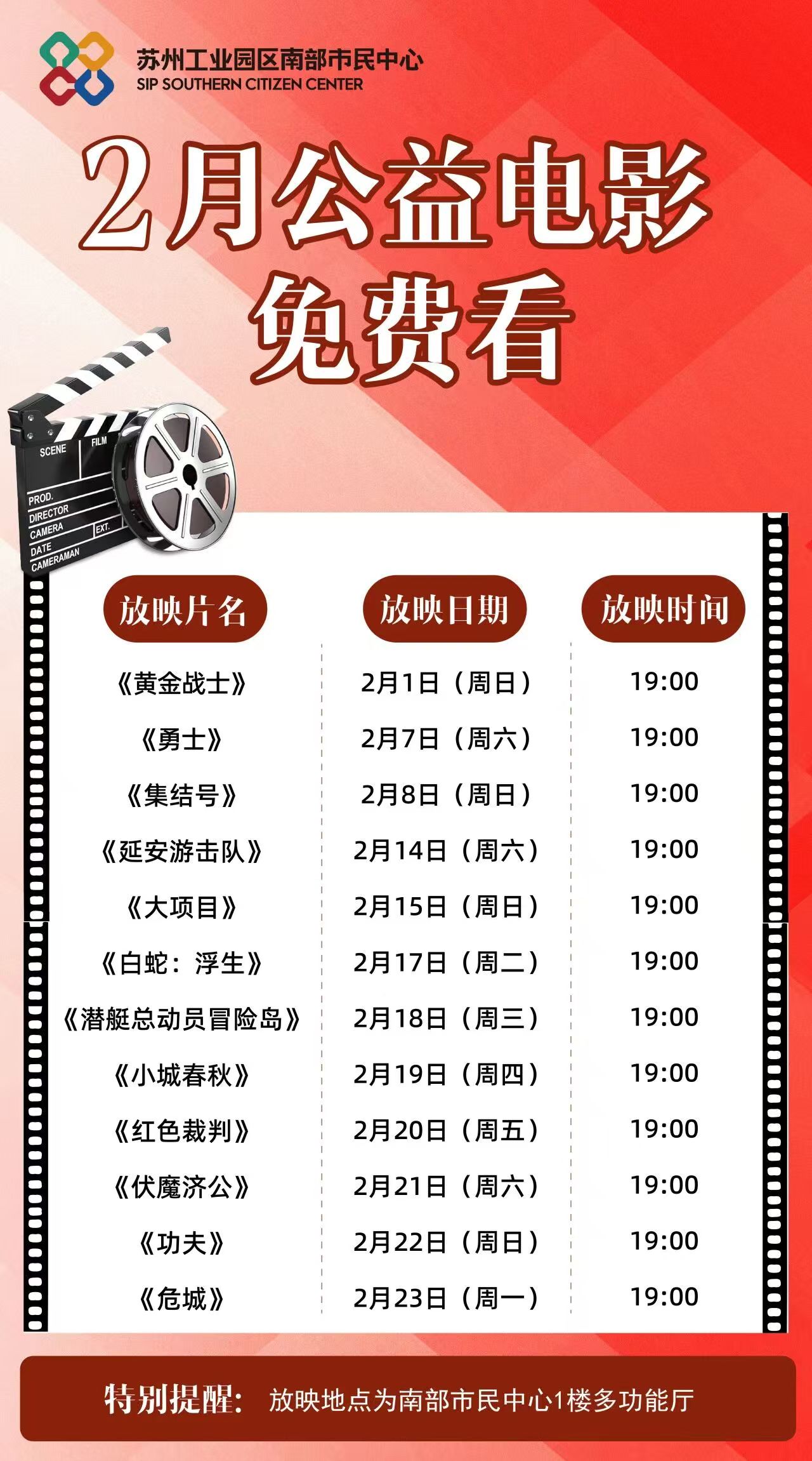 春節期間,文化惠民不打烊。園區南部、北部市民中心將推出公益電影展映,二十余場經典影片免費播放,包括《白蛇:浮生》《小城春秋》《功夫》等等,讓市民在團圓之余,享受一份輕松愉悅的光影之樂。
