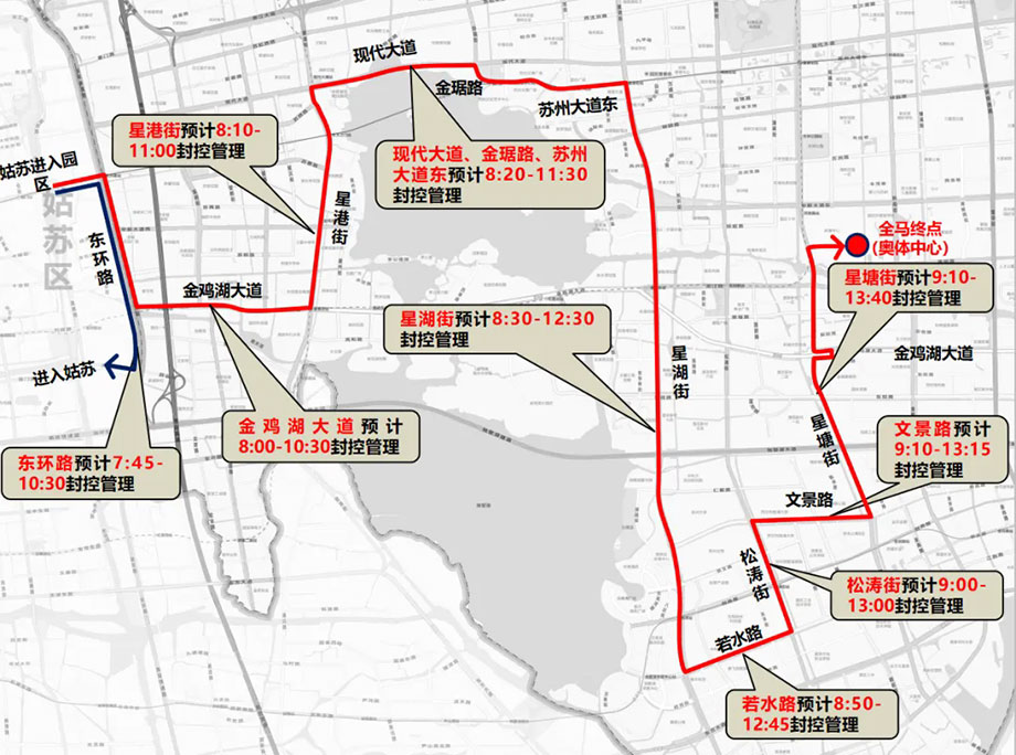 此次蘇馬,園區路線長、范圍廣,為保障賽事進行,同時最大化減少對市民游客出行的影響,園區賽段將分時分路段實施全封閉、半封閉、半幅封閉的臨時交通管控,同時針對婁葑片區、湖西CBD片區、湖西中茵皇冠周邊、湖東CWD片區、月亮灣片區、斜塘片區、蘇州大學附屬第四醫院(獨墅湖醫院)等區域,提供區域機動車繞行方案。園區相關酒店在公安等多部門的指導下,也提前準備,積極做好出行提醒,讓市民游客充分感受到城市的熱度與溫度。