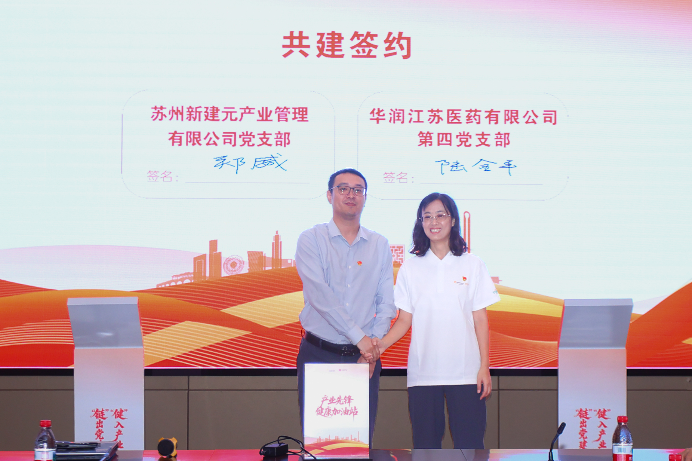 活動(dòng)現(xiàn)場(chǎng),新建元產(chǎn)管黨支部與華潤(rùn)江蘇醫(yī)藥第四黨支部簽署共建協(xié)議,發(fā)布健康節(jié)“黨建服務(wù)區(qū)服務(wù)清單”,并揭牌“產(chǎn)業(yè)先鋒健康加油站”。雙方明確,后續(xù)將不斷深化共建內(nèi)涵,促進(jìn)資源共享、優(yōu)勢(shì)互補(bǔ),以“黨建紅”驅(qū)動(dòng)“產(chǎn)業(yè)藍(lán)”、服務(wù)“健康綠”,進(jìn)一步打通健康產(chǎn)業(yè)上下游、左右岸,釋放“1+1>2”的聚合效應(yīng),助力產(chǎn)業(yè)發(fā)展“延鏈、強(qiáng)鏈、補(bǔ)鏈”,為企業(yè)搭建技術(shù)突破與市場(chǎng)拓展的創(chuàng)新平臺(tái),推動(dòng)園區(qū)健康產(chǎn)業(yè)集聚發(fā)展。
