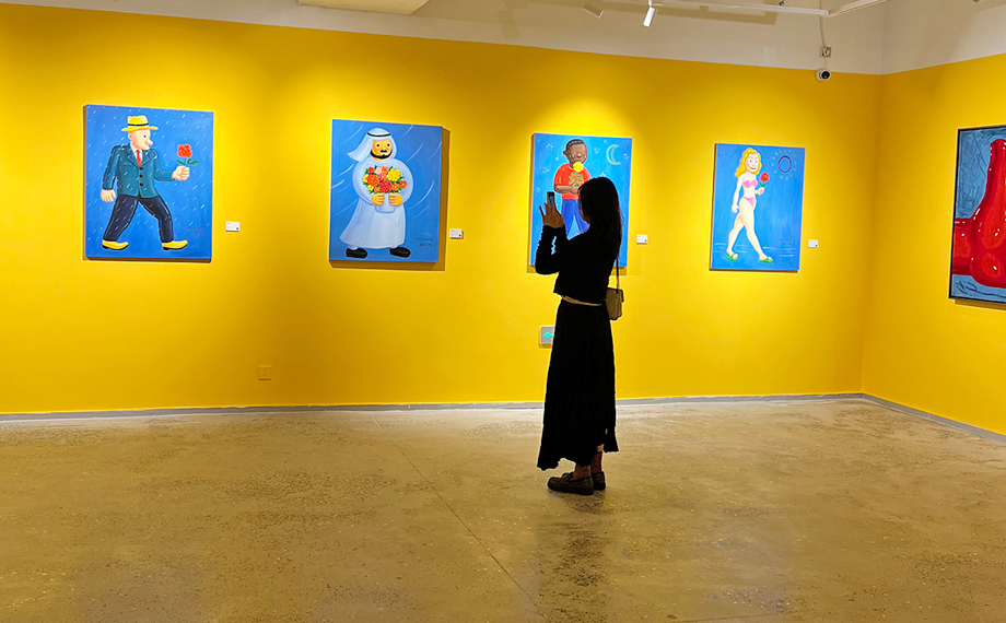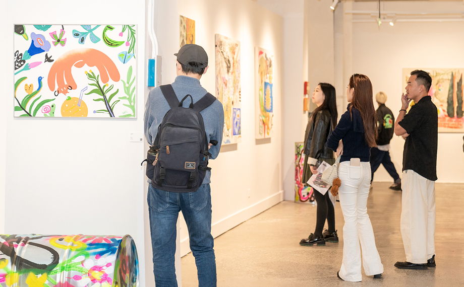 走進展廳,波普藝術的鮮明色彩、涂鴉藝術的自由表達與潮玩IP的可愛萌趣相互交融,仿佛進入一個“異托邦”的平行世界。“情書”“國際玩笑”“有錢花”“FAFA”“猿腦波”……每一件作品,既映射著被消費主義、社交媒體和品牌敘事包裹的現實,又承載著藝術家對潮流文化的獨特思考。現場觀眾仿佛置身于多元立體的藝術空間,不時駐足拍照、交流探討,現場反響熱烈。