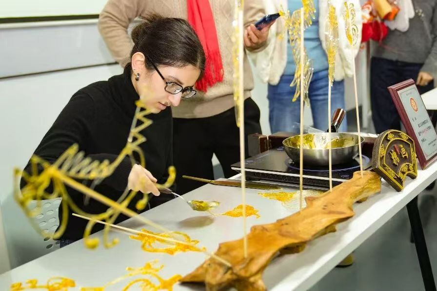 “糖畫不僅是一道美食,更是中國人對(duì)甜蜜生活、吉祥如意的寄托。”糖畫技藝傳承人李瑤的講解娓娓道來。在他的指導(dǎo)下,外籍學(xué)子們迫不及待展開體驗(yàn),他們親手執(zhí)勺、以糖為墨,嘗試勾勒出駿馬、燈籠等寓意吉祥的新春元素。金黃色的糖漿如絲綢般流淌,眨眼間,一個(gè)個(gè)生動(dòng)的圖案便在光潔的石板上凝固成型,引得陣陣驚嘆。