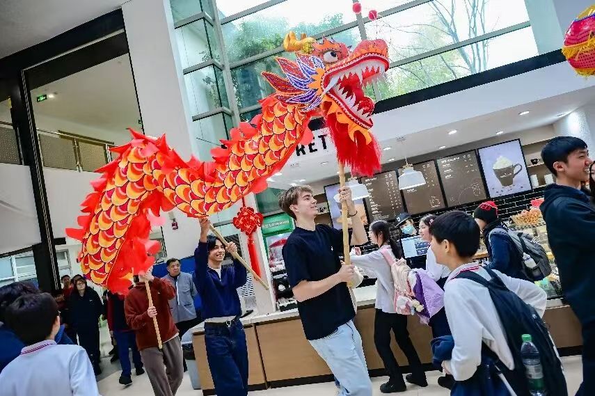 慶典融合了氣勢恢宏的舞龍舞獅,以及精妙絕倫的川劇變臉,各學部也推出了獨具特色的慶祝活動。其中,中學部開展以“文化融合”為主題的劇院盛會,呈現合唱、民樂、戲曲串燒等節目;小學部通過盛裝巡游,涵蓋鼓樂、舞蹈、短劇等豐富形式的表演集會,以及可以體驗十余項傳統手工藝的年味集市歡慶佳節;幼兒園的孩子們則在趣味手工坊中,通過制作馬頭帽、體驗拓印、毛氈畫等游戲化活動,快樂觸摸傳統節日的脈搏。