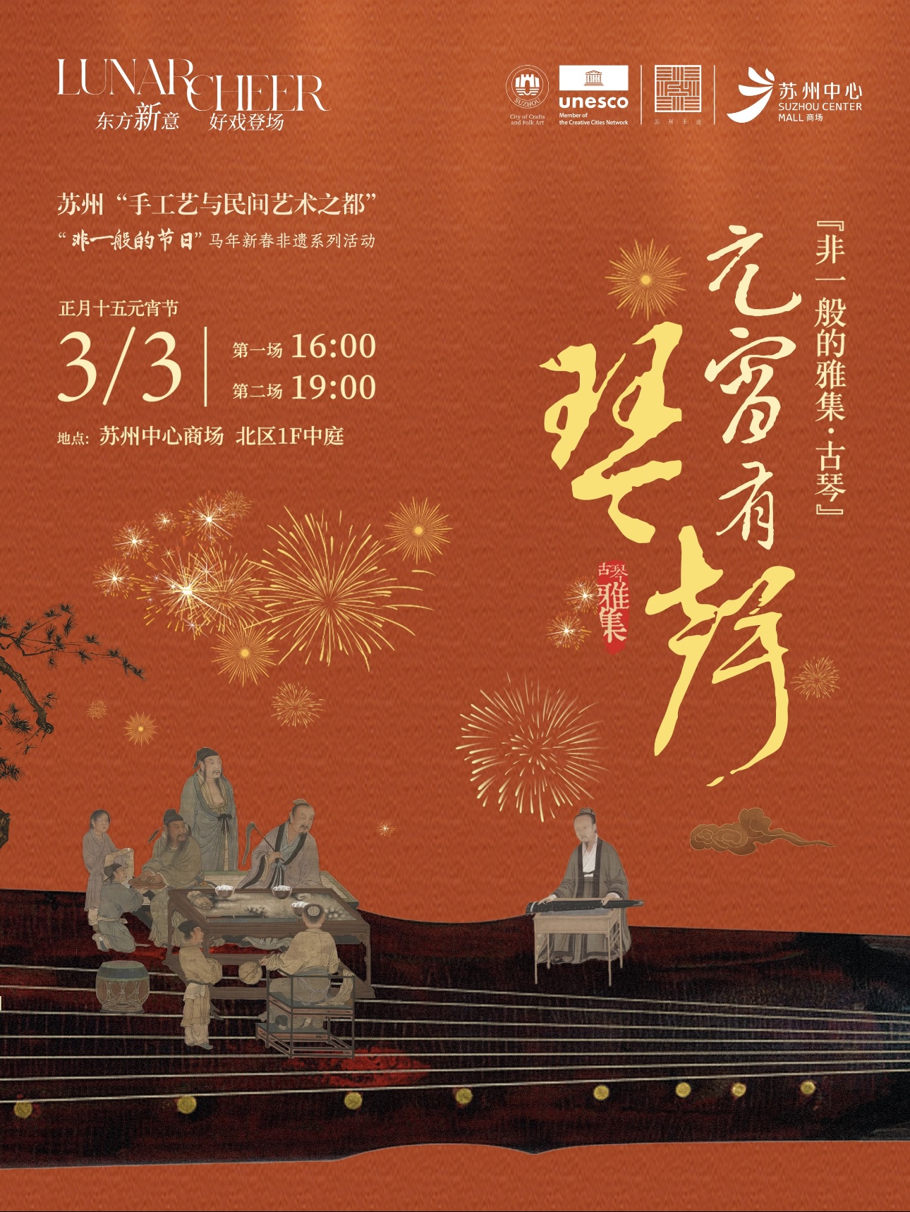 3月3日,蘇州中心商場(chǎng)北區(qū)一樓中庭將舉辦“非一般的雅集?古琴”專(zhuān)場(chǎng)。指尖輕撥,清音流轉(zhuǎn),邀市民與游客共赴一場(chǎng)滌蕩心靈的聽(tīng)覺(jué)雅集。現(xiàn)場(chǎng)將奏響《賽馬》《梅花三弄》《上春山》等經(jīng)典曲目,共設(shè)兩場(chǎng)演出,分別于16:00、19:00開(kāi)場(chǎng)。元宵佳節(jié),不妨移步蘇州中心,聽(tīng)一曲清音入耳,共賞雅韻。