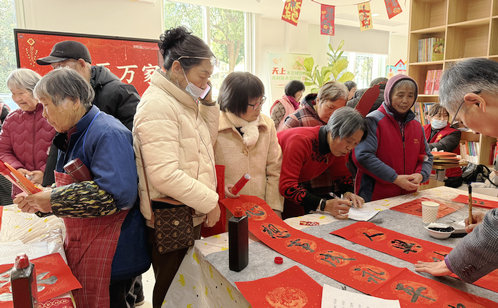 Moreover, several calligraphy enthusiasts wrote Spring Festival couplets bearing auspicious messages on site, and a group of volunteers then distributed the couplets to residents.