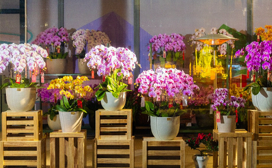 At the central square along Tianmu East and West Streets, diverse elegant blossoms including pure-white narcissus, golden double-petaled daffodils, sweet camellias, graceful phalaenopsis and colorful tulips drew crowds of passersby, who paused to admire the dazzling floral displays.