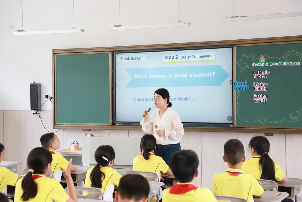 婁葑實驗小學的王玨老師執(zhí)教的《Beingagoodstudent》采用項目化的課程設(shè)計,用制作大海報作為整節(jié)課的主線串聯(lián)。課堂中,王老師充分運用AI賦能,服務(wù)課堂,從主題的確認,框架設(shè)計到內(nèi)容填補這樣一種海報設(shè)計思路將六上前四個單元知識點進行了整合和拓展,學生在任務(wù)驅(qū)動的過程中英語綜合素養(yǎng)得到了提升。