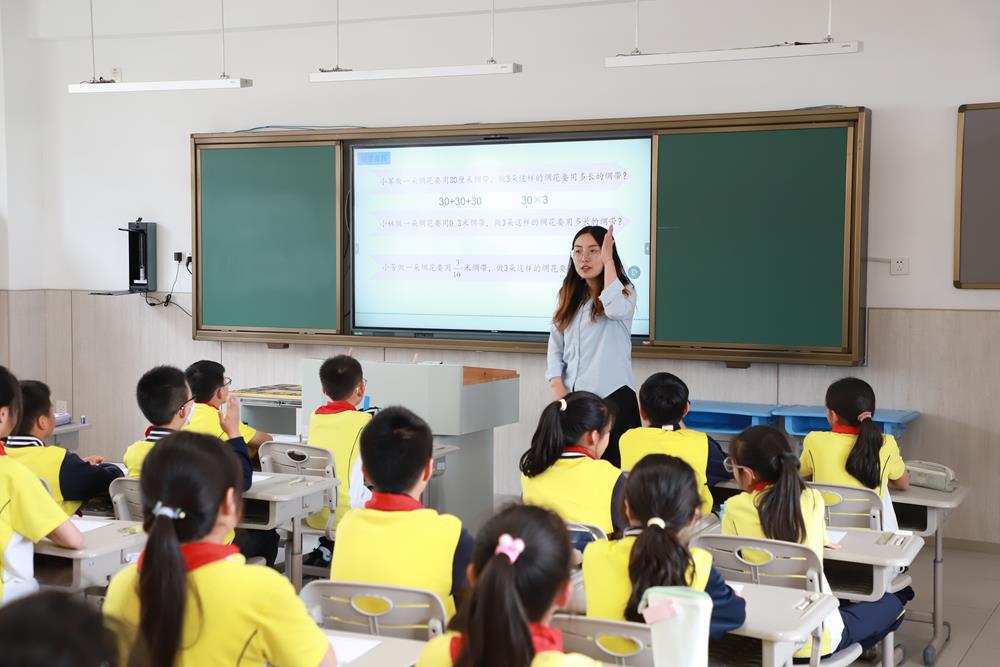 勝浦實驗小學趙敏芳老師執(zhí)教《分數(shù)乘整數(shù)》一課,通過創(chuàng)設(shè)“制作綢花”的情境,引導(dǎo)學生理解分數(shù)乘整數(shù)的意義與算理。教學中,趙老師鼓勵學生自主探索,借助畫圖、算式和文字說明等多種方法驗證算法,并對比整數(shù)、小數(shù)乘法的共性,深化對乘法算理一致性的認識。課堂注重學生實踐與思考,層層遞進,既鞏固了計算方法,又培養(yǎng)了數(shù)學遷移能力,充分體現(xiàn)了新課標的核心素養(yǎng)要求。